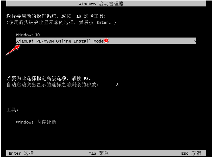 来到开机选项界面,如图示,选择第二项进入xiaobai-pe系统。