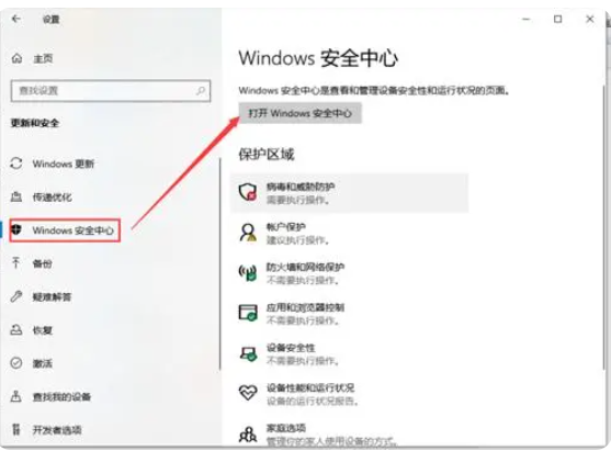 2、点击左侧选择【windows安全中心】,再点击右侧【打开windows安全中心】。