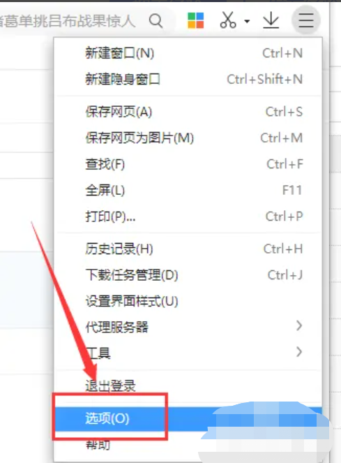 2、在弹出的菜单栏中点击“选项”或者“设置”(不同浏览器下拉框目录有一些不同)进入。