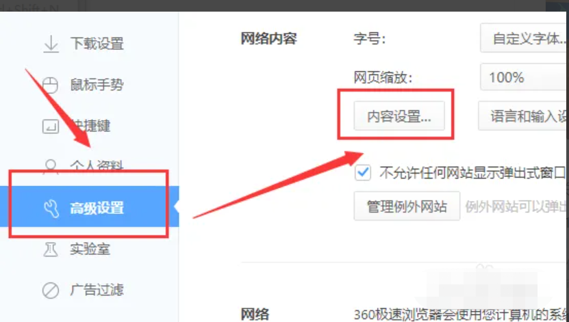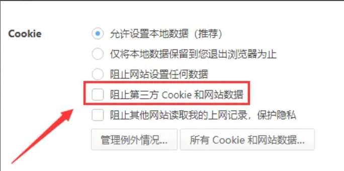 4、在“网页设置”下点击“网页内容高级设置”,在“Cookie”下将“阻止第三方Cookie和网站数据”前的勾选去掉即可
