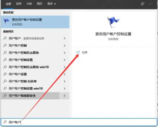 1、打开win10搜索栏,搜索【用户账户】然后选择【更改用户账户控制设置】进入。