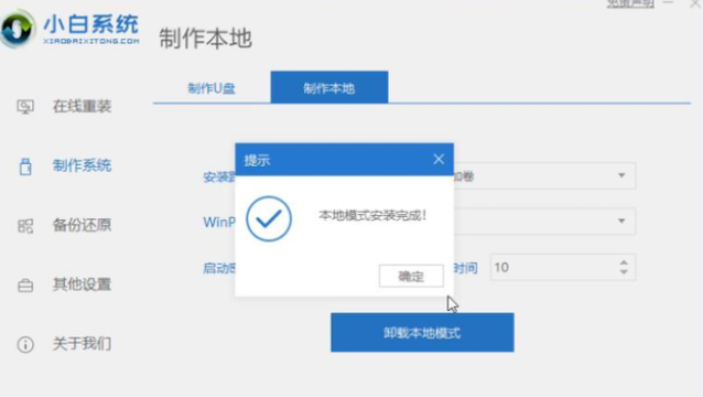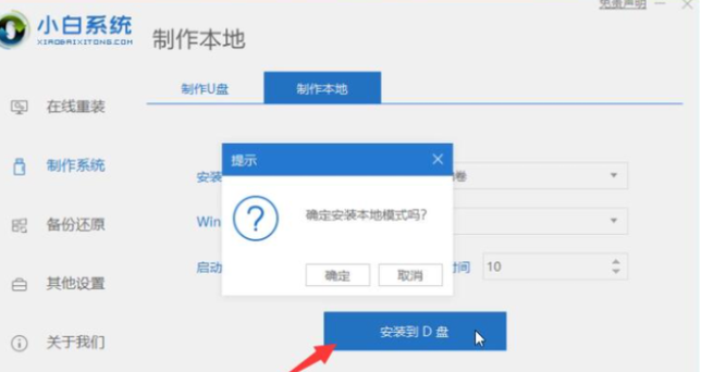 3、当我们打开小白一键重装系统软件之后,选择制作系统按钮,选择制作本地,安装路径选择除C盘外的其他盘,比如D盘。