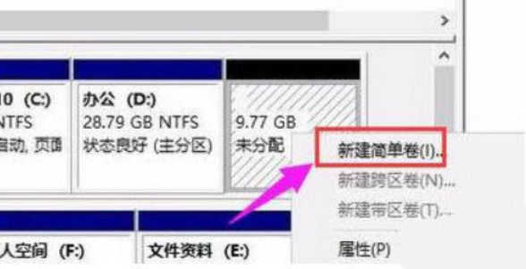 6、压缩完成后会看到一个未分配的分区,右击选择“新建简单卷”。