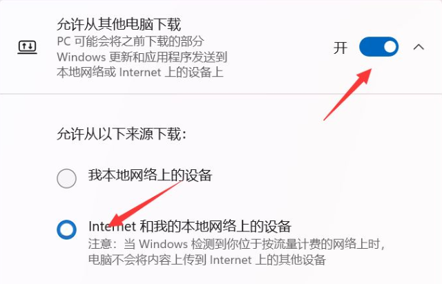 4.在传递优化的窗口中,我们把【允许从其他电脑下载】的按钮打开,下方选中【internet和我的本地网络上的设备】功能完成。