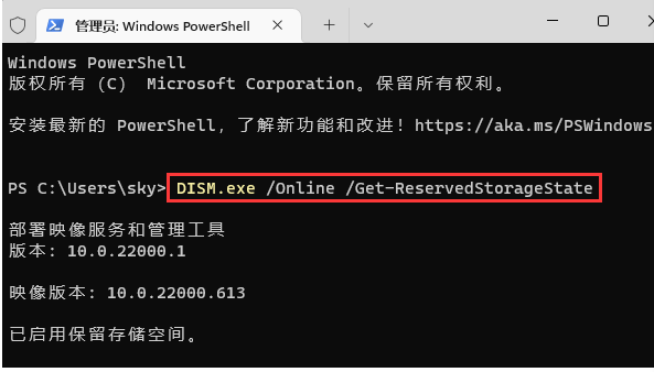 步骤二:使用DISM快速禁用或启用保留空间:查询系统保留空间是否启用DISM.exe /Online /Get-ReservedStorageState。