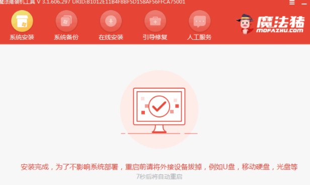 6.系统安装完成后会自动重启,我们重启之前记得拔掉外接设备。