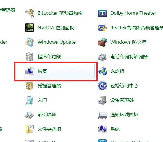 4、接下来,在控制面板页面中,找到“恢复”菜单项,进入系统恢复页面。