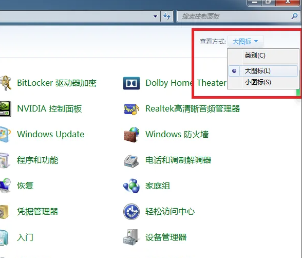 3、打开控制面板主页面之后,点击页面右上角“查看方式”设置项,切换为“大图标”显示页面。