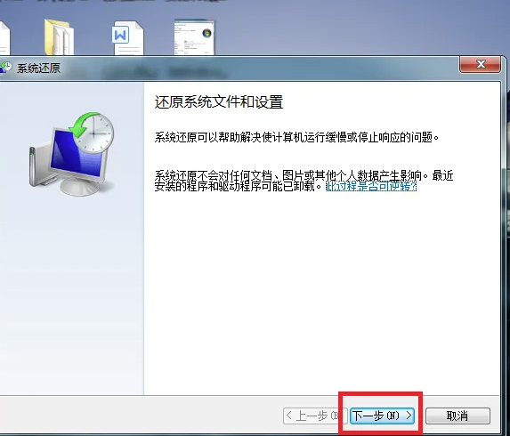 6、在打开的系统还原页面中,点击页面底部中间的“下一步”按钮。