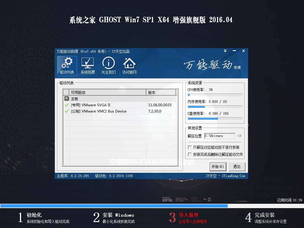 3、 集成常见硬件驱动,智能识别+预解压技术,绝大多数硬件可以快速自动安装相应的驱动。