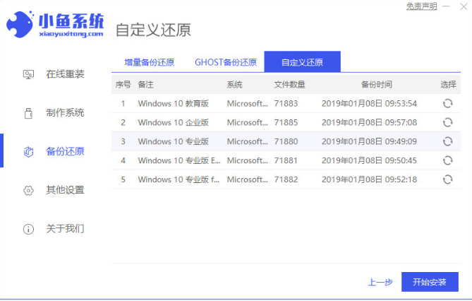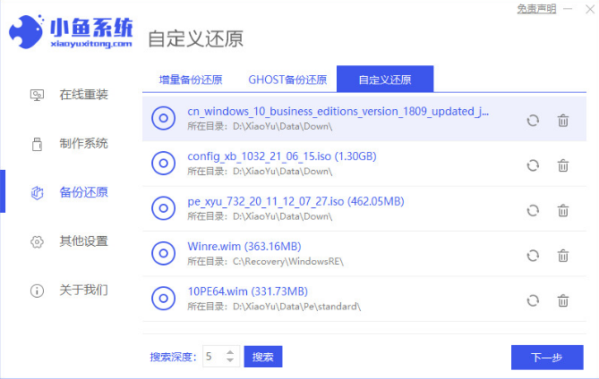 2、在备份还原页面选择“自定义还原”,然后选择我们需要安装的win10系统镜像进入下一步。