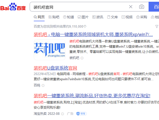 1、在搜索引擎输入装机吧官网。