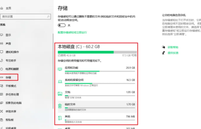 3.在左侧栏找到存储打开,在这里我们可以看到C盘的数据详情,我们可以知道你的C盘的数据占比,然后我们根据自身需求清理它们。