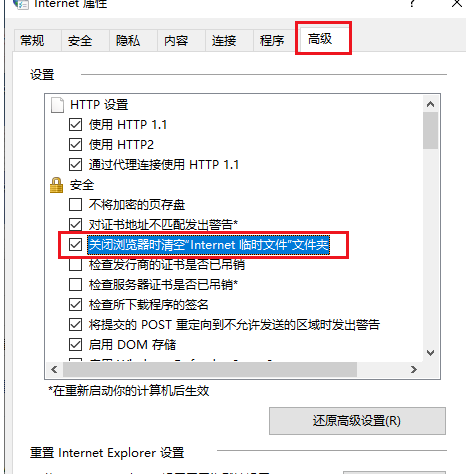 3.在弹出的窗口找到高级,并勾选关闭浏览器时清空Internet 临时文件。