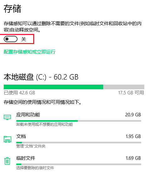 首先我们安装之前的步骤找到存储,然后把存储感知关闭就可以了。