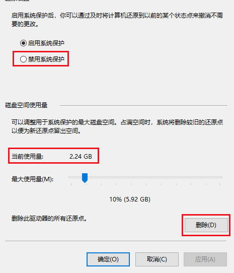 4.在这里我们可以直接点击禁用系统保护,关闭系统还原功能,并删除系统还原的文件,但是如果你的C盘空间还很足,我们也可以考虑保留系统还原功能和它的文件,因为关键的时刻可以利用系统还原来找回重要数据。