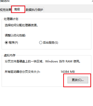 4.在性能选项的界面我们找到顶部菜单高级,最后点击更改,即可打开虚拟内存设置。