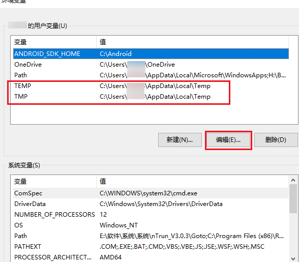 4.在环境变量中,我们依次选中TEMP和TMP,点击编辑。