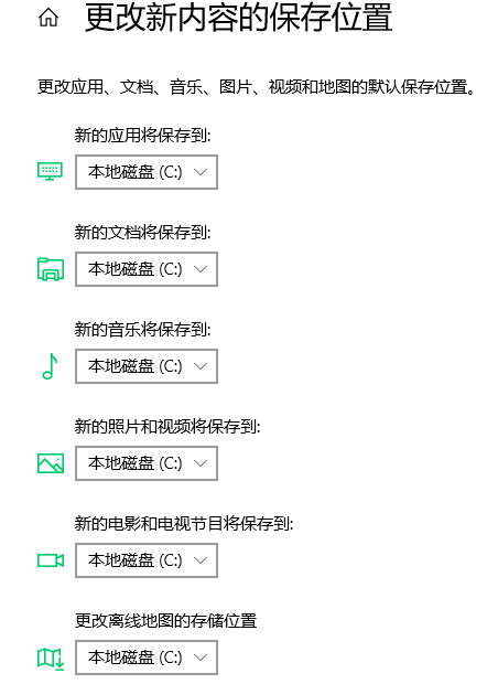 我们打开更改新内容的保存位置,将它们统统修改至其他盘,从而减少C盘的负担。