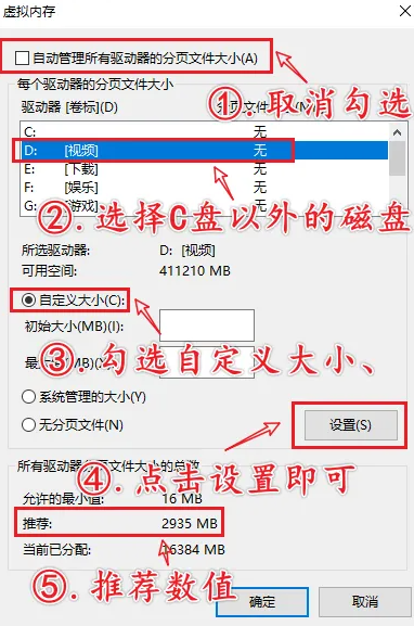 5.首先取消勾选自动管理所有驱动器的分页文件大小,接着勾选任意一个除C盘以外的磁盘,然后点击自定义打下,下方有系统推荐的数值,最后点击设置,然后确定即可。