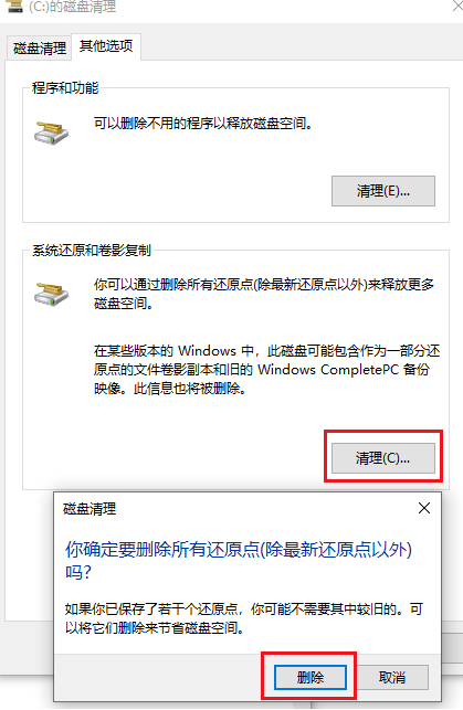 1.我们找到磁盘清理——清理系统文件,来到上方菜单栏的其他选项,找到系统还原和卷影复制,我们点击清理,在弹出的弹窗中点击删除就可以了。