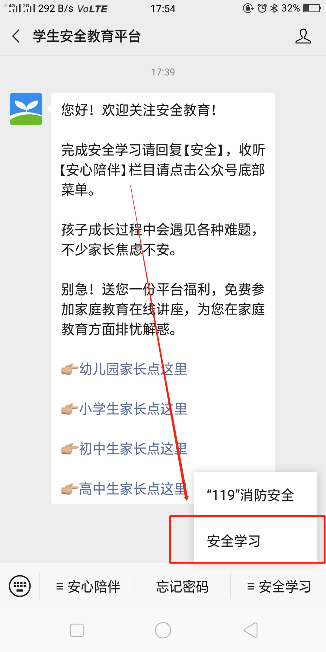 关注后点击右下角菜单栏的“安全学习”—“安全学习”进行登录;