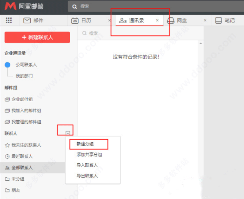 点击左侧“联系人”菜单的右方的图标打开菜单,选择新建分组;