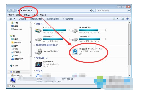 1、首先需要将移动硬盘与电脑连接,插入USB到电脑接口。点击打开电脑的资源管理器,进入硬盘。