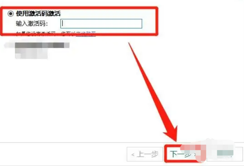 3、选择【使用激活码激活】,在下面输入激活码,点击下一步激活即可。