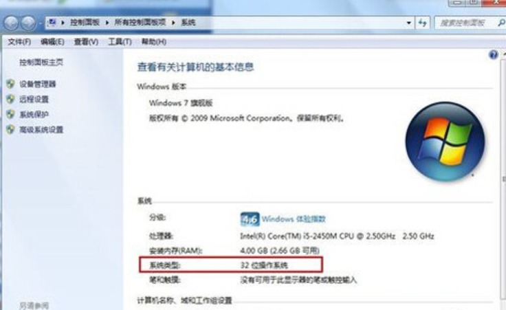 3、左键点击“属性”,弹出“计算机的基本信息”框,在“系统类型”那一排就会显示是32位还是64位。