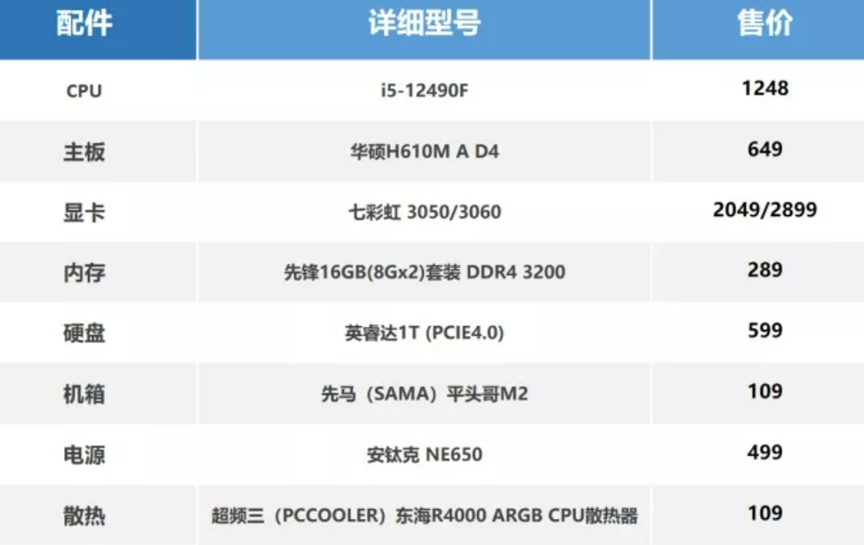 12 代酷睿当中,12600K是非常强悍的存在,而去掉核显的KF只要1999,性价比实际上更高,在配置上也很灵活,以下配置实际上还可以继续优化,3060Ti升级到3070Ti目前的价格差别就700元(实际性价比3070Ti还是非常高的),电源 可以照样用,这个清单可以优化出一个低价版本的,也可以直接搭配3050显卡,其他的内存,电源,固态硬盘都可以往下调整,不过CPU的性能就有点浪费,这套相当于当年顶配的2080super主机。