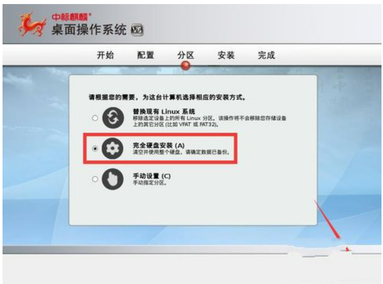 7.然后按照系统安装提示进行操作,当显示如图所示的“分区”配置页面中,根据实际需要进行选择,在此选择“完全硬盘安装”项,双击“下一步”按钮。