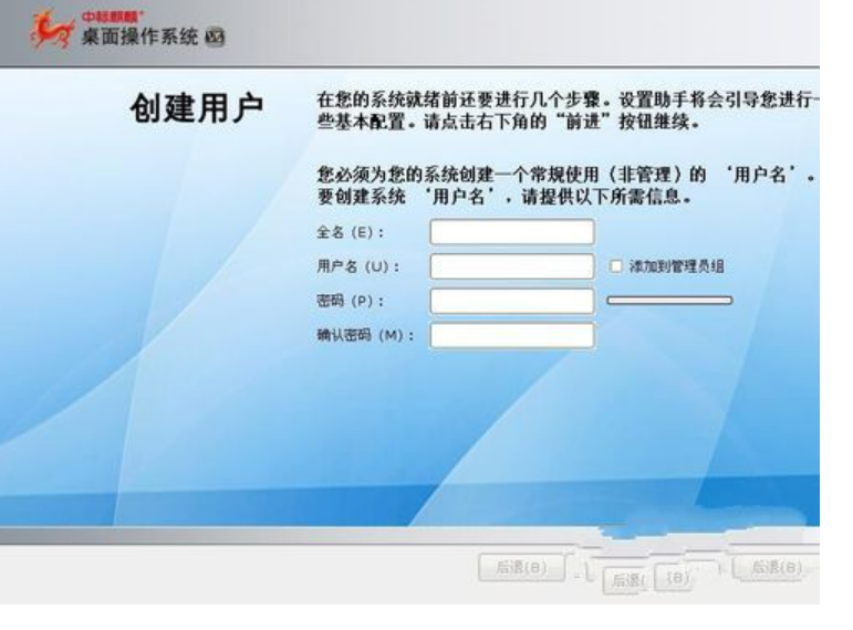11.接下来需要创健一个普通用户账户,可以通过选择“添加到管理员组”以创建一个管理员账户就可以了,这样的中标麒麟操作系统就安装完成。