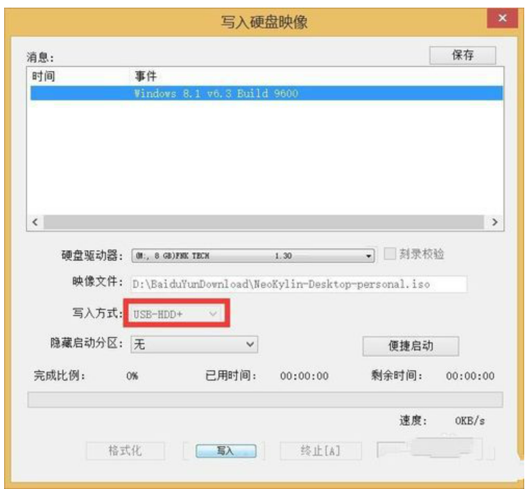 4.再打开的“定稿硬盘镜像”窗口中,从“磁盘驱动器”列表中选择“U盘”,同时将“写入方式”设置为“USB-HDD”,点“写入”按钮即可创建启动U盘。