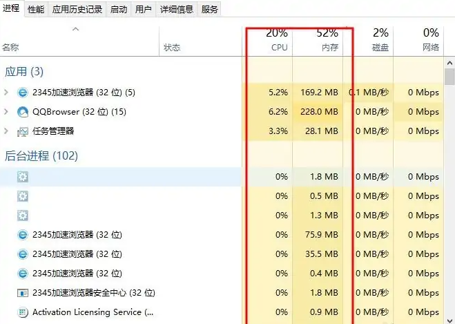 3、注意一下cpu的内存占用的情况,如果发现有程序占用了很大的内存的话,那就是顽固的病毒程序,需要进行清理。