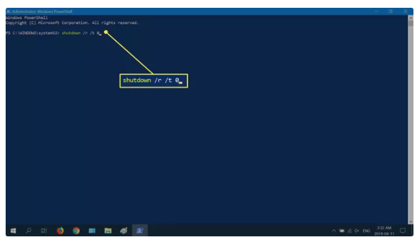 3、然后输入命令shutdown /r /t 0,再按回车键。