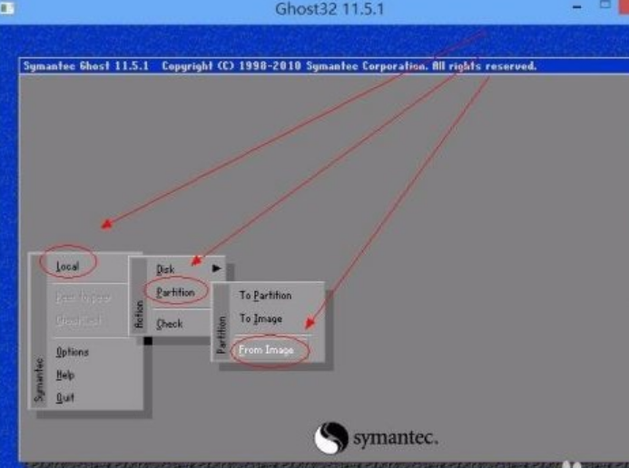 1、打开Ghost后,选择Local,在选择Partition,最后点击From Image。