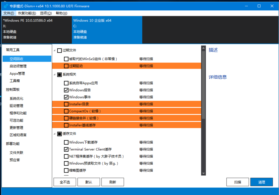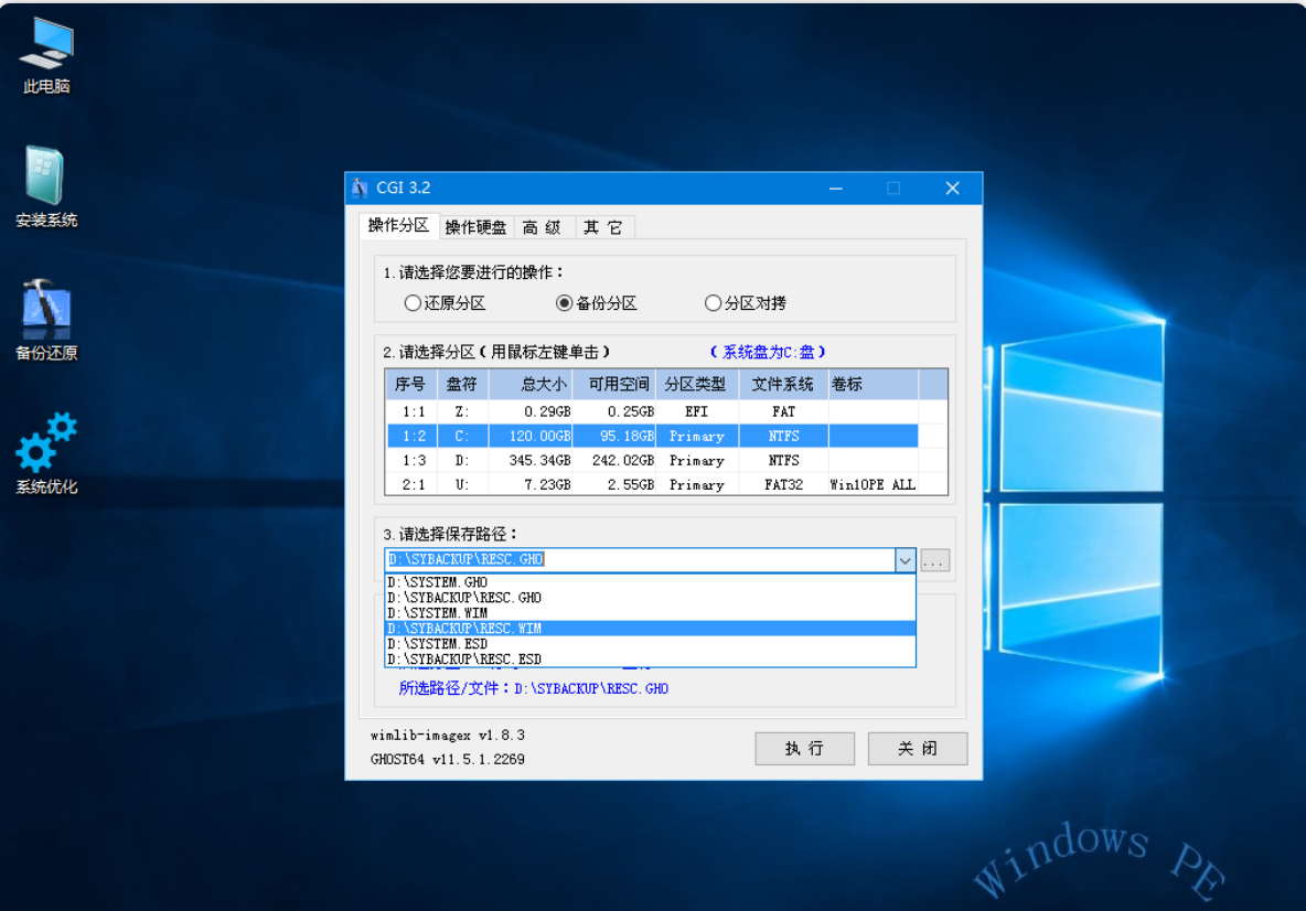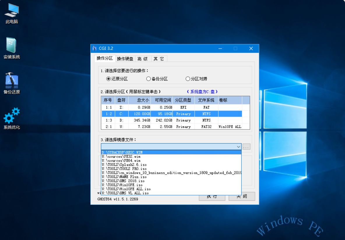 系统备份还原有许多的方法,在这个PE上可以用于备份的方法是dism(WIM )、CGI )、gho、WIM、ESD )。 恢复方法为dism(WIM )、CGI )、gho、WIM、ESD等)、WinntsEtup )、WIM )。 上图为CGI的备份恢复。 使用它,可以备份和恢复的格式很多,速度很快。 WIM格式可以进行增量备份。 也就是说,一个备份有多个还原点。