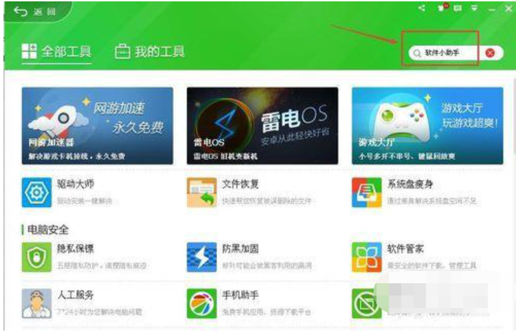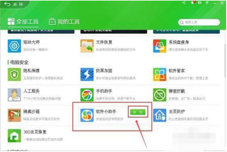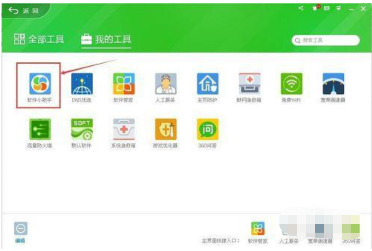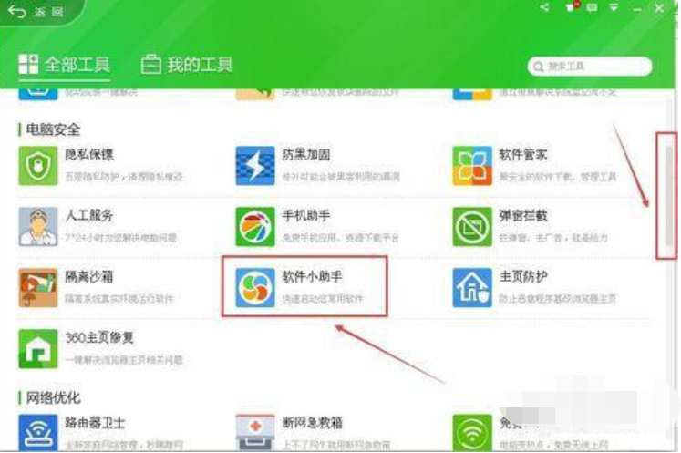 4、还有一个方法就是点击360安全卫士的“更多”后在出现的“全部工具”窗口中直接把滚动条往下拉,在中间位置就会看到有“软件小助手”这一项,如图所示: