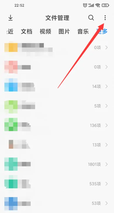 1、进入小米手机的文件管理界面,点击右上角三点符号。