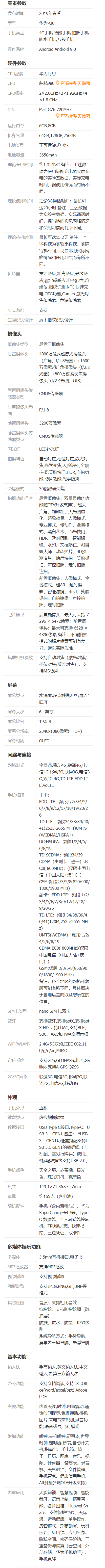 1、我们可以从官方提供的华为p30的参数配置图中可以看到详细的配置信息,具体如下图所示:
