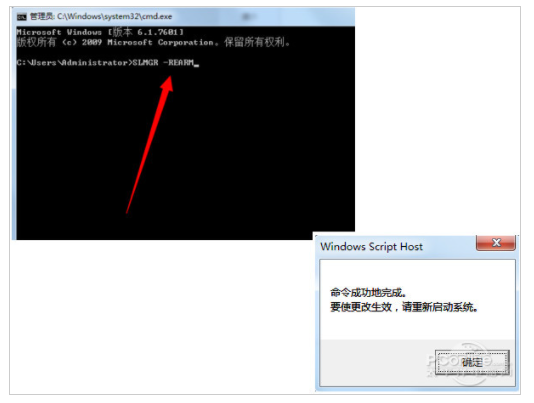3.进入命令行的界面,输入 SLMGR -REARM 命令,按回车,耐心等待弹出下图提示对话框,点击确定重启电脑就可以啦。