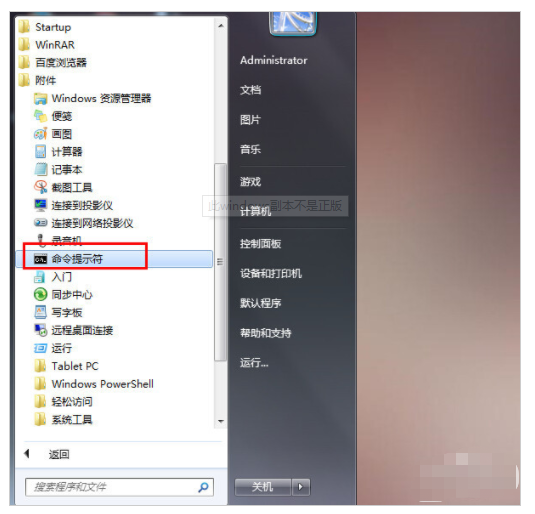 2.打开附件,点击命令提示符选择以管理员方式运行;