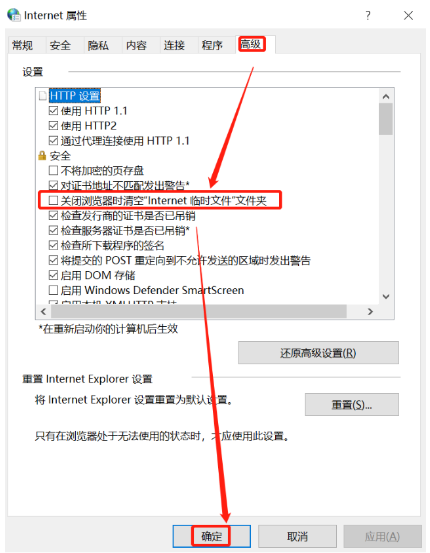 3、再点击属性内的【高级】选项卡,勾选【关闭浏览器时清空Internet临时文件夹】并鼠标点击确定即可清理。