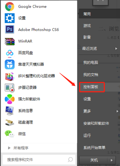 1、首先点击【开始】菜单,再选择系统的【控制面板】打开。