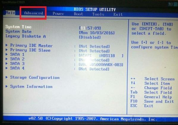 1、电脑蓝屏代码0x0000007b解决方法,首先重启电脑,在电脑出现第一界面时快速的按下del键,进入bios页面,再通过键盘上的左右键切换到在“Advanced”选项,进入下一步。