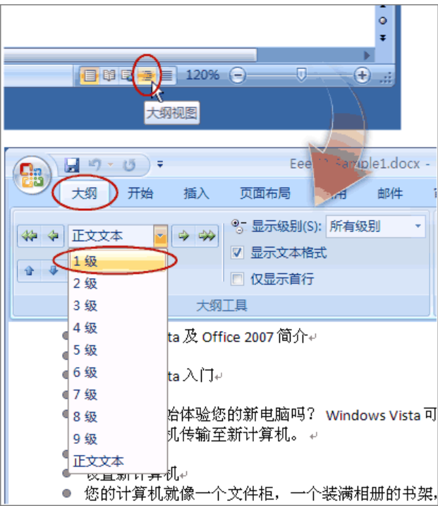 2、接着用光标停在某个第一级标题上,左上角的下拉框拉开,选1级。同样,光标停在某个第二级标题上,下拉框界面中选2级,将整个文档的结构给标注出来即可。