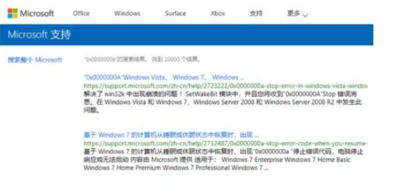4、在代码查询界面,鼠标点击搜索,将会跳转到微软的官网,即可在微软官网内查找相关的蓝屏信息。