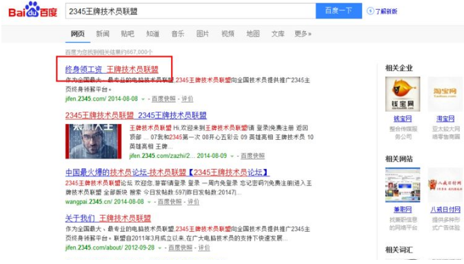 1、打开百度首页,输入2345王牌技术员联盟,然后选择第一个进入,如图。