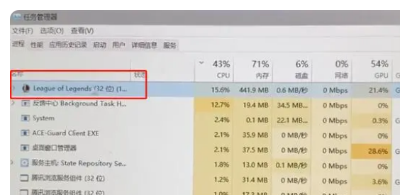 1、按住Ctrl+ALT+Del呼出任务管理器,之后我们选择进程,在里面找到LOL的进程,选择后面的32位或者64位的那个,然后我们把进程结束,结束之后客户端便可以重启加载,不过仅适用于Win10。这样做的最大优势在于,我们不需要重新排队,不用去忍受那99999+的痛苦,也不耽误我们和开黑的朋友继续玩游戏,非常实用和方便。